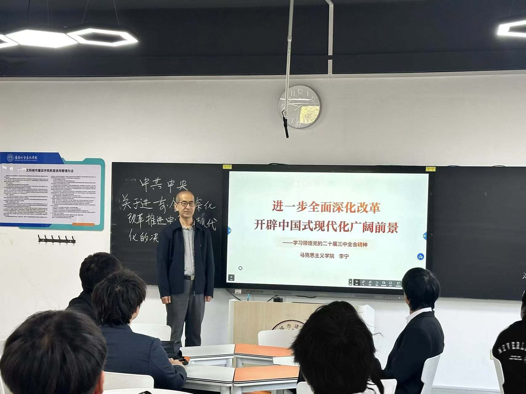 李宁以《进一步全面深化改革 开辟中国式现代化广阔前景》为题,从新时代全面深化改革的重大成就、进一步全面深化改革的总目标和原则、进一步全面深化改革的重大举措、进一步全面深化改革的根本保证四个部分,帮助学员们深入学习领会党的二十届三中全会精神。同时,他还结合生动的案例和翔实的数据对党的二十届三中全会精神的核心内容和要点作了阐述,并鼓励同学们将全会精神贯彻落实到日常学习生活中,加强学习,不断提高自己的政治素养和专业能力,为推进中国式现代化贡献自己的力量。